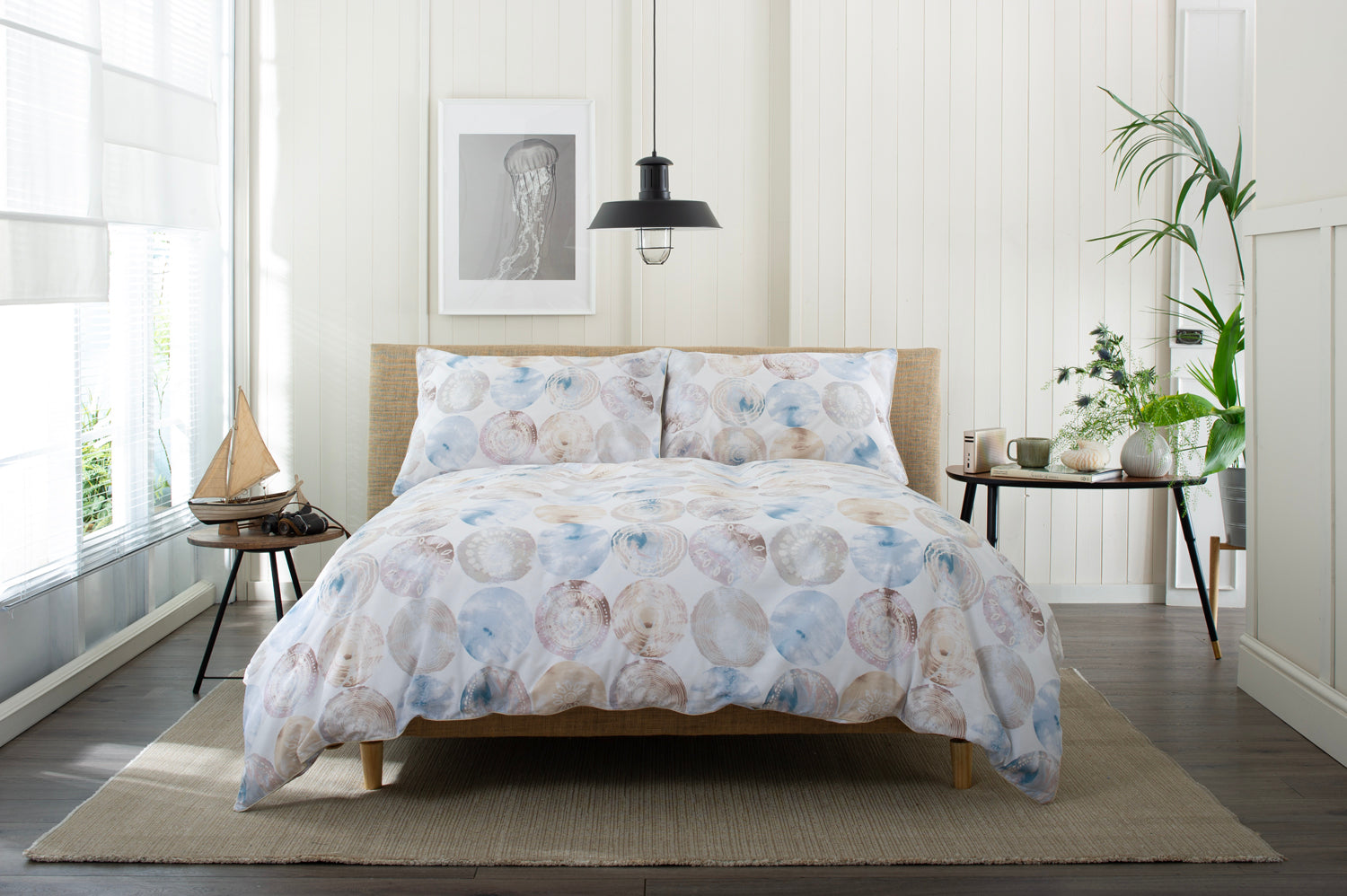 Inspired by natural seaside treasures, the Mother of Pearl Duvet Set by Lobster Creek brings a relaxed coastal charm to your bedroom. Crafted from soft, breathable cotton, this set features a delicate circular shell print in calming tones of sand, stone, and ocean blue.