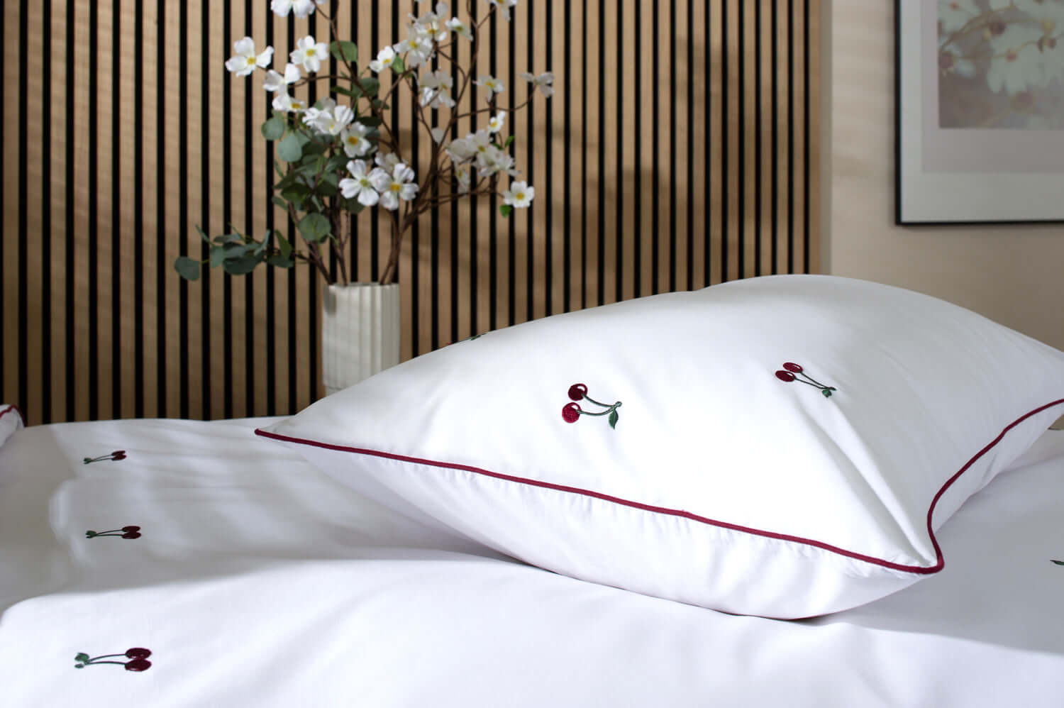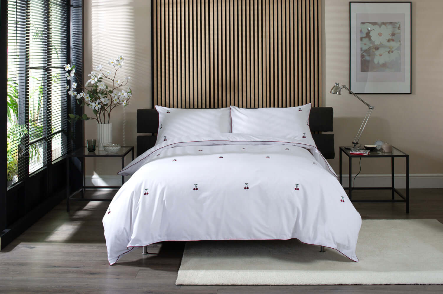 Add a playful yet elegant twist to your bedroom with the Mon Cheri Duvet Set by The Lyndon Company. Made from 100% natural cotton, this beautifully crafted duvet cover is detailed with delicate cherry embroidery across the face and finished with a rich burgundy piped edging for a polished look.
